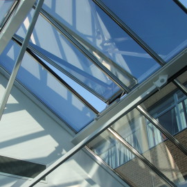 The newly created space is top-lit with a pitched glass roof, bordered by a network of sunpipes which enable the introduction of diffused natural light. The glass roof includes sensor operated opening lights to enable the discahrge of excess heat and the introduction of natural ventilation.